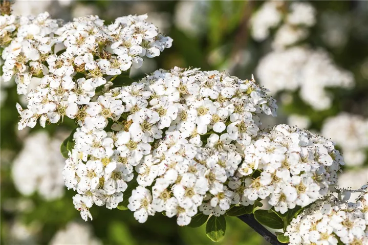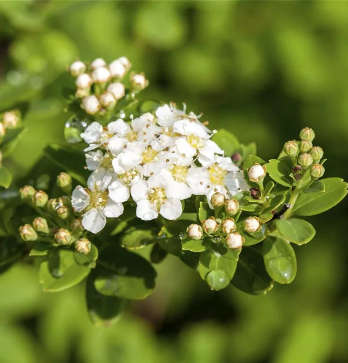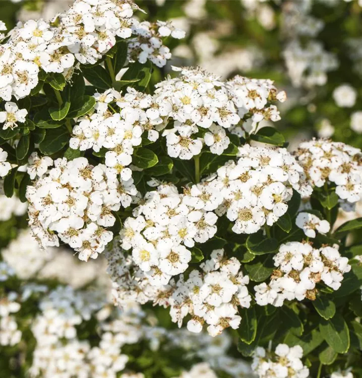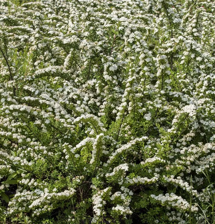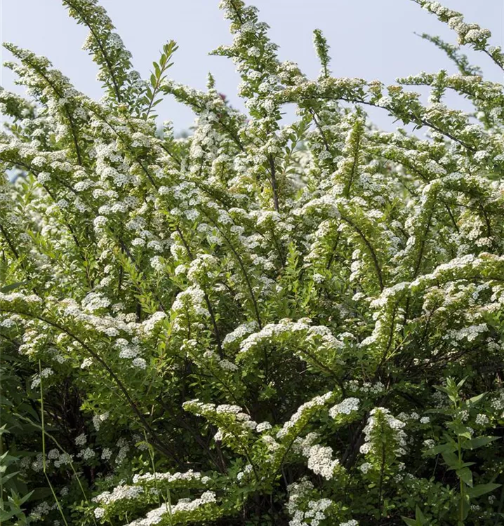 Die weißen Blüten der Strauchspiere 'Snowmound' erscheinen in Doldentrauben von Ende Mai bis Juni.