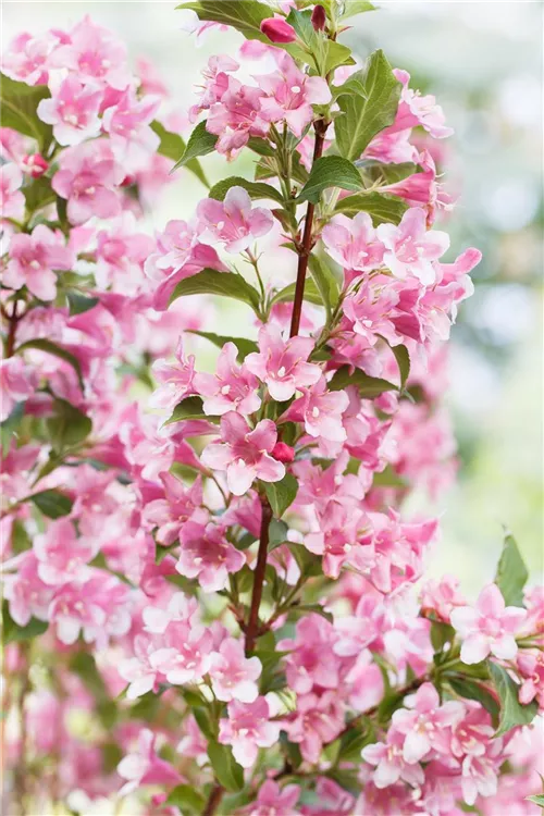 Rosa Weigelie ist ein buschig und aufrecht wachsender Großstrauch. Sie erreicht gewöhnlich eine Höhe von 3 - 3,5 m und wird ca. 3 - 4 m breit.