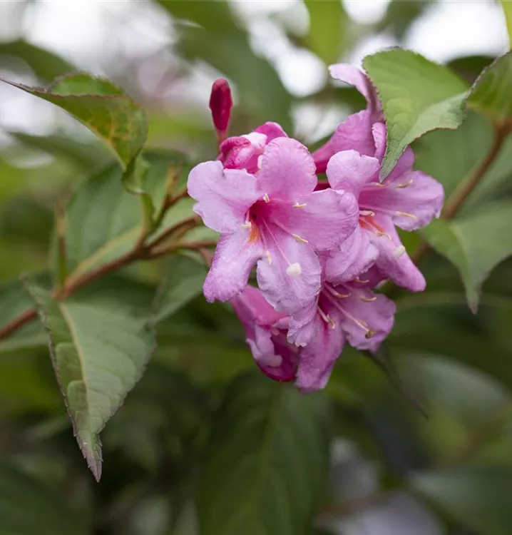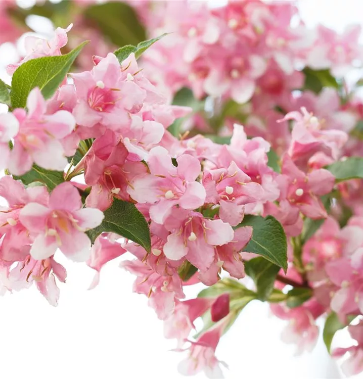Die Rosa Weigelie (Weigela florida) ein buschiger, aufrechter Großstrauch, der, je nach Sorte, trichterförmige Blüten in verschiedenen Farben hervorbringt. An einem sonnigen bis halbschattigen Standort mit durchlässigem, nährstoffreichem Boden erreicht sie gewöhnlich eine Höhe von ca. 3,5 m und wird ca. 4 m breit.