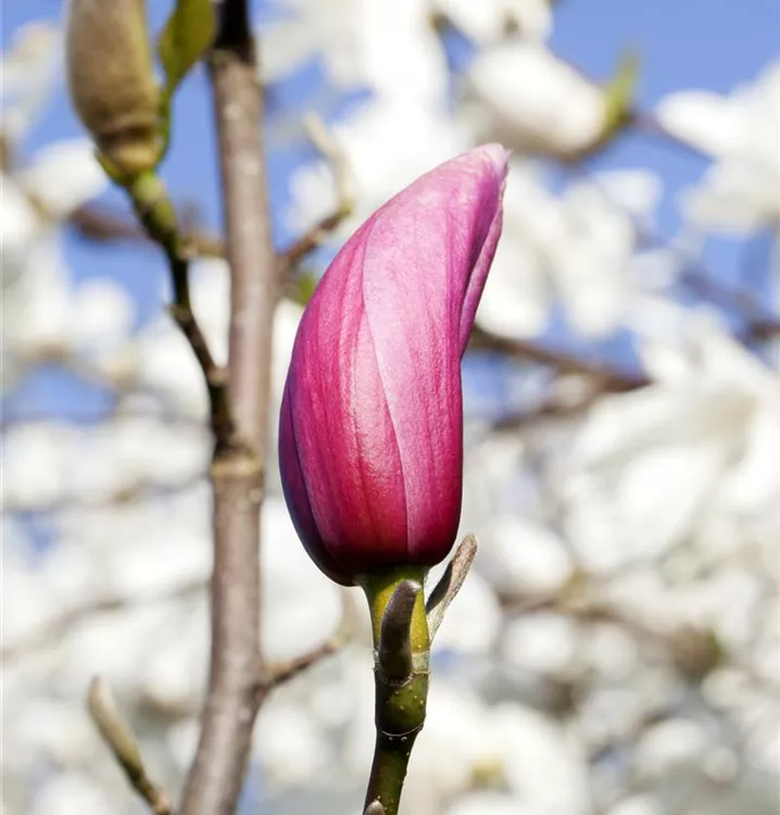 Die Purpurmagnolie (Magnolia liliiflora) ein strauchartiger Großstrauch, der, je nach Sorte, trichterförmige Blüten in verschiedenen Farben hervorbringt. An einem sonnigen bis halbschattigen Standort mit durchlässigem, humosem, nährstoffreichem Boden erreicht sie gewöhnlich eine Höhe von ca. 4 m und wird ca. 3 m breit.
