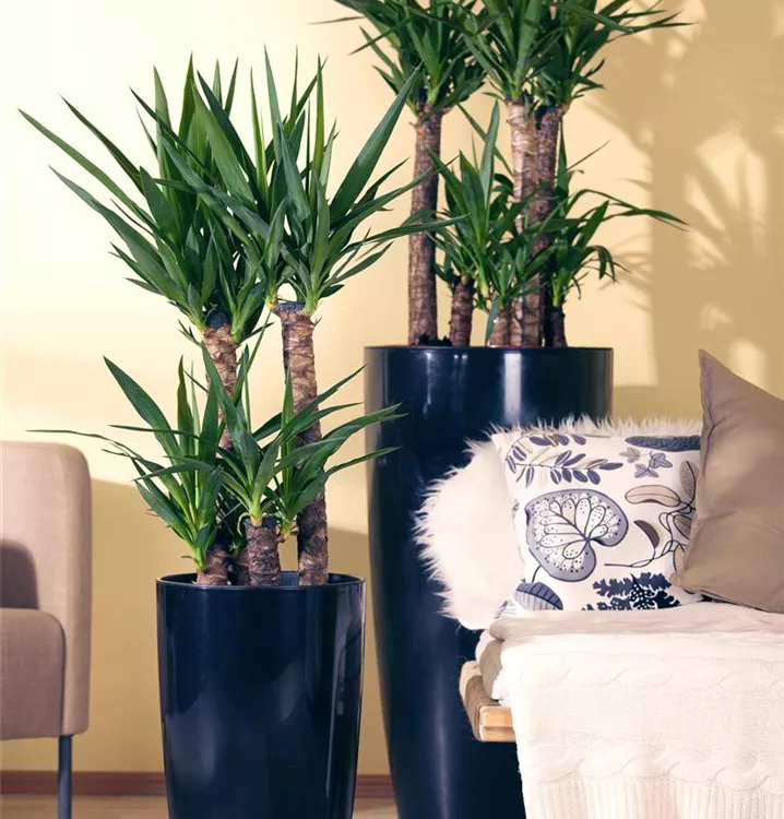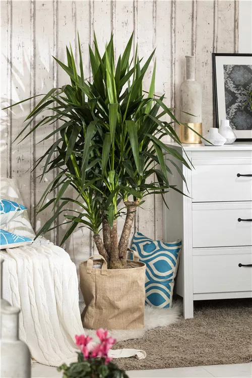 Die Riesen-Palmlilie (Yucca elephantipes) trägt dunkelgrüne, lineale, matte Blätter. Diese aufrechte Pflanze gedeiht am besten an einem sonnigen Standort.