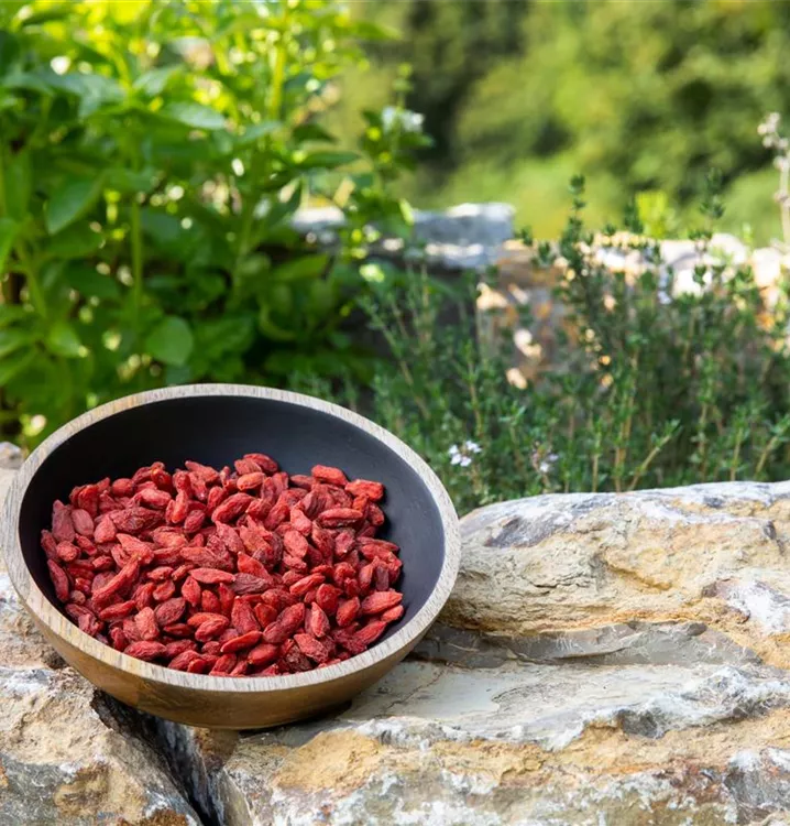 Die Goji-Beere (Lycium barbarum) bildet rote Beeren. Diese sind süß-säuerlich, aromatisch im Geschmack. Für eine ertragreiche Ernte ab August schaffen durchlässiger, kalkhaltiger, nährstoffreicher Boden und ein sonniger bis halbschattiger Standort optimale Bedingungen. Auch ihre purpurroten Blüten sind eine schöne Erscheinung.