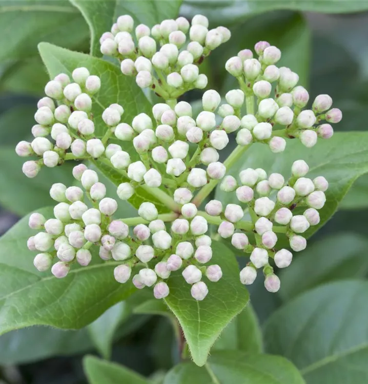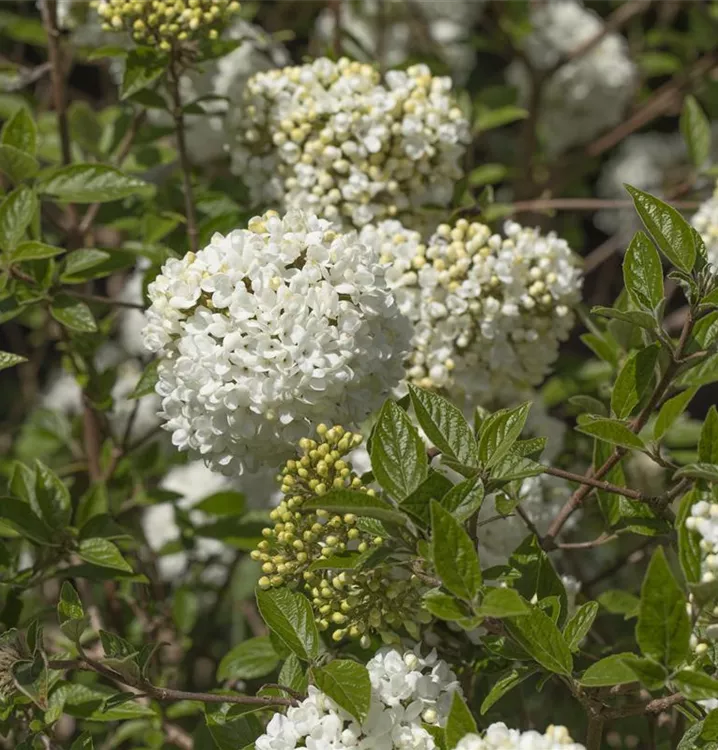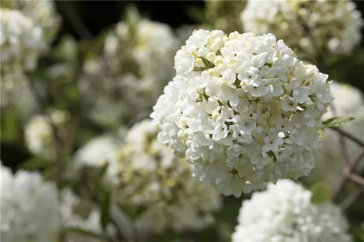 Die cremeweißen Blüten des Schneeball 'Eskimo' erscheinen in Trugdolden von April bis Mai. Diese sind stark duftend. Bei richtiger Pflege Nachblüte im Oktober.