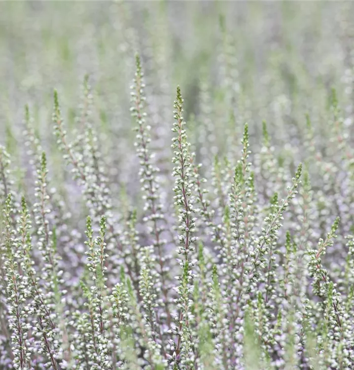 Die rosafarbenen, roten, weißen, glockenförmigen Blüten der Besenheide erscheinen in Trauben von Juli bis Oktober.