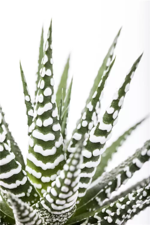Die Blätter der Haworthie sind grün-weiß, lanzettlich, gezähnt.